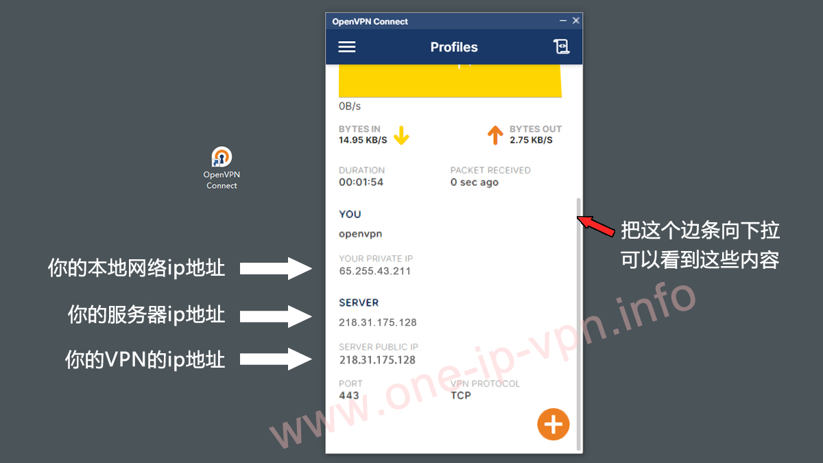 把边条向下拉动,可查看本地网络ip地址,可以看到你连接到的服务器ip地址,vpn的ip地址